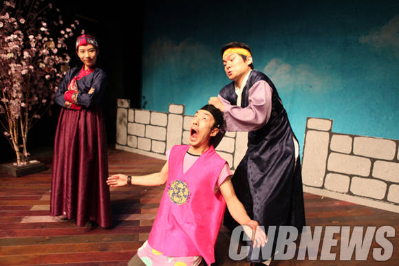 ▲연극 '애정빙자사기극' 무대 현장에서 (왼쪽부터)배우 황희정, 김지안, 황영준이 열연을 펼치고 있다.(사진제공=여우별컴퍼니)