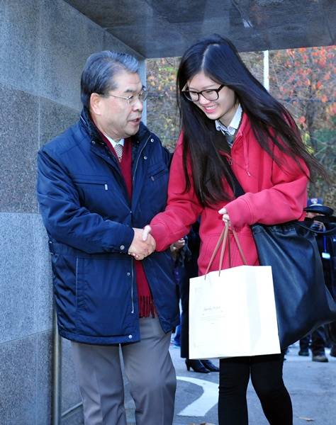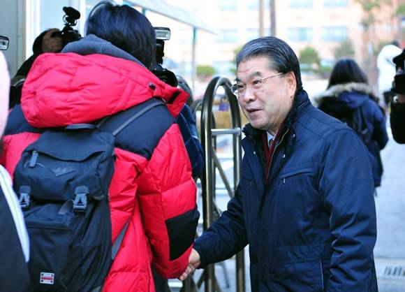 이재정 경기도교육감은 13일 오전 2015학년도 대학수학능력시험이 치러지는 수원 조원고등학교 시험장 교문 앞에서 수험생들을 격려했다.