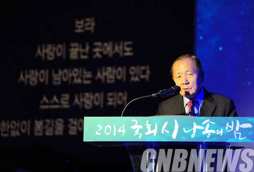 ▲대한민국 국회와 한국문화원연합회가 공동으로 주최하고 문화체육관광부가 후원하는 ‘제12회 국회 시 낭송의 밤’ 행사가 13일 국회 헌정기념관에서 열렸다. 이날 참석한 김동호 문화융성위원회 위원장이 정호승 시인의 ‘봄길’을 낭송하고 있다 (사진=문화체육관광부)