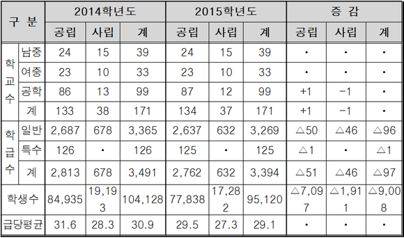 이는 전년대비 일반학급 96학급, 특수학급 1학급이 감축된 것으로, 학급 감축의 주요인은 내년 중학생수 9천8명 감소에 기인한 것이다.