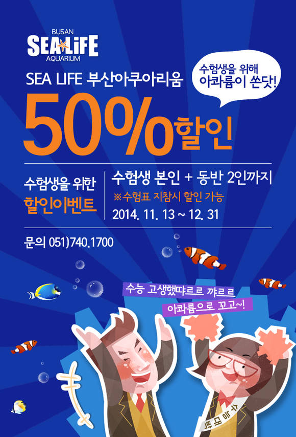 이번 이벤트는 2015학년도 대학수학능력시험을 치른 수험생들을 대상으로 수험생 본인 및 동반 2인까지 입장료 50% 할인 혜택을 제공하며, 아쿠아리움 방문시 본인의 수험표를 지참해 매표소에서 제시하면 누구나 혜택을 받을 수 있다.
