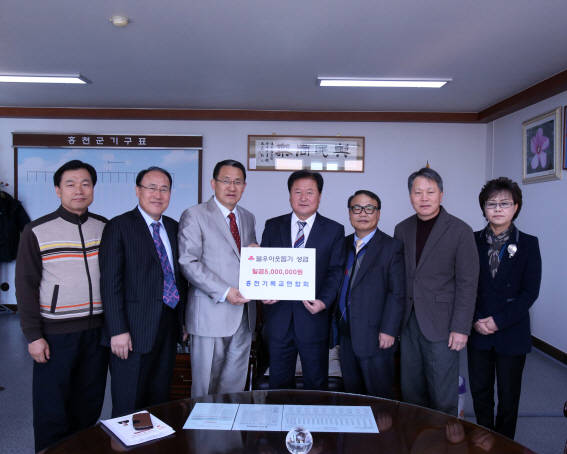 홍천기독교연합회(회장 이민수)는 지난 14일(금) 오전 11시께 홍천군청을 방문해 불우이웃 돕기에 써 달라며 500만 원을 홍천군에 기탁했다.