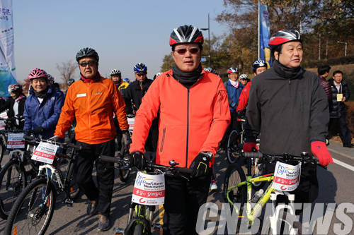 ▲정의화 국회의장과 새누리당 김무성 대표최고위원(우측)은 11월 15일 오후 국회 중앙잔디밭에서 열린 ‘원코리아 뉴라시아 자전거 평화대장정 서울입성식’에 참석했다.(사진=국회)