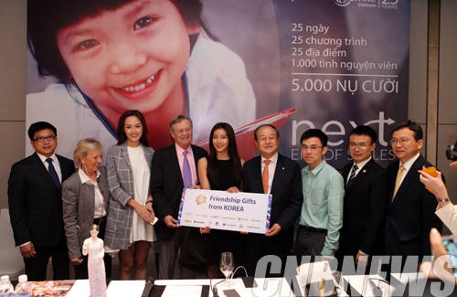 ▲15일 오전 Operation Smile Vietnam 25주년 기자회견에서 한국기업의 기부물품을 전달하는 하지원.(사진=KOTRA)