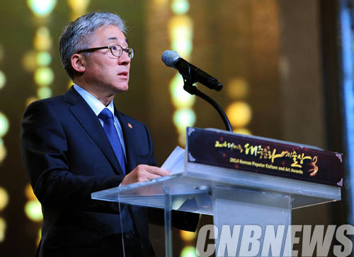 ▲17일 서울 대학로 홍대 아트센터에서 한국 대중문화예술 발전과 한류 확산에 기여한 자들에게 수여되는 ‘2014 대한민국 대중문화예술상’ 시상식이 열렸다. 이날 김종덕 문화체육관광부 장관이 박근혜 대통령의 축사를 대독하고 있다. (사진=문화체육관광부)