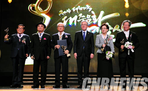 ▲17일 서울 대학로 홍대 아트센터에서 한국 대중문화예술 발전과 한류 확산에 기여한 자들에게 수여되는 ‘2014 대한민국 대중문화예술상’ 시상식이 열렸다. 이날 김종덕 문화체육관광부 장관이 문화훈장 수훈을 마친 뒤에 기념촬영을 하고 있다. 왼쪽부터 코미디언 송해, 가수 명국환, 성우 김수일, 김종덕 문화체육관광부 장관, 방송작가 박정란, 배우 최불암 .(사진=문화체육관광부)