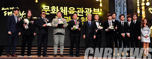 이날 김종덕 문화체육관광부 장관이 차세대 한류를 이끌어가는 대세 아이돌 엑소(EXO), 가수 이승기, 안무가 정진석, 배우 김보성, 코미디언 김준현, 연주자 김재만, 프로듀서 고건혁씨에게 문화체육관광부장관 표창 수여를 마친 뒤에 기념 촬영을 하고 있다.