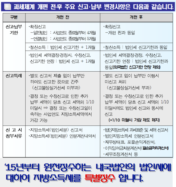 과세체계 개편으로 법인지방소득세는 내년도 신고(4월)부터 법인세와 동일한 과세표준에 ‘지방세법’에서 정한 세율을 적용해 산출한 세액을 신고·납부해야 한다.