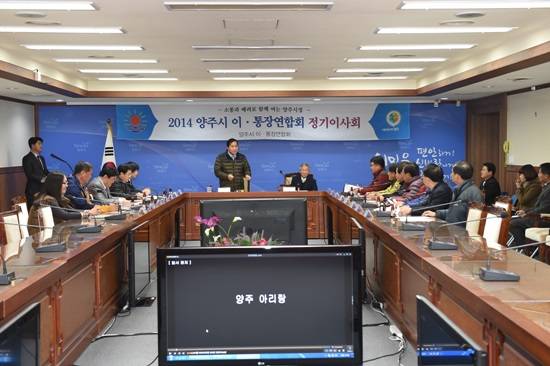 양주시는 19일 시청 상황실에서 ‘양주시 이통장연합회 정기회의’를 개최했다. 현삼식 양주시장을 비롯한 관내 이통장연합회장 및 회원 30여명이 참석한 가운데 열린 이번 회의는 오는 2015년 양주시정을 홍보하고 지역발전을 위하여 안건에 대한 토의를 실시하는 시간을 가졌다.