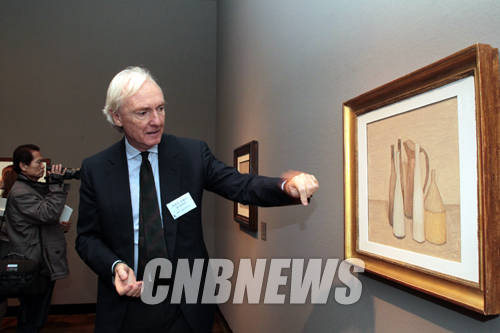 이날 함께한 지안프랑코 마라니엘로 이탈리아 볼로냐 미술관 협회 회장이 전시장에 설치된 조르조 모란디의 작품 세계에 대해 설명하고 있다.