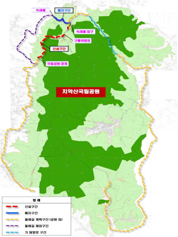 치악산 둘레길 조성 사업은 총 69km 구간 중 우선 1단계 사업으로 행구동 국향사를 시점으로 한 소초면 일원에 33.8km에 대해 탐방로를 조성하는 사업으로 협약을 통해 원주시와 치악산국립공원사무소가 협력하여 탐방로의 효율적 관리 및 치악산권역 관광산업의 활성화에 기여할 것으로 기대된다.