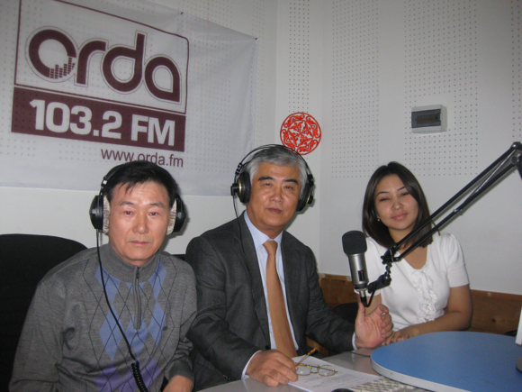 ▲황태규 부산지역 의료원장(가운데)이 카자흐스탄 현지 라디오방송에 출연해 의료상담을 진행하고 있다. (사진제공=해운대백병원)