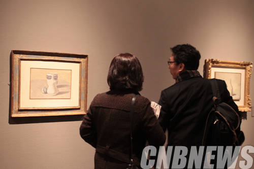 ▲국립현대미술관 덕수궁관에 설치된 조르조 모란디의 정물 작품을 관람객들이 감상하고 있다.(사진=왕진오 기자)