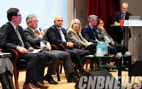 이날 김종덕 문화체육관광부 장관과 사지드 자비드 영국 문화미디어체육부(DCMS) 장관이 포럼 발표자과 함께 ‘한국 정부의 문화콘텐츠산업 진흥정책’이라는 주제로 열린 정책토론 분과 토의에 참석하고 있다.