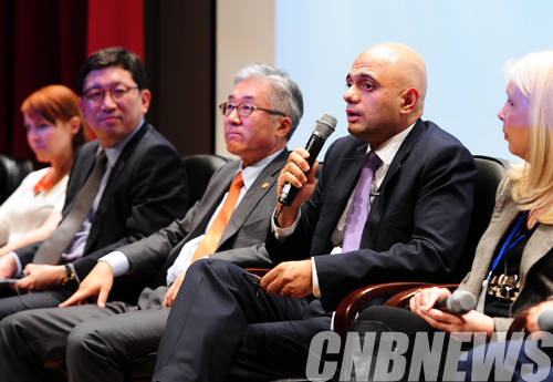 이날 사지드 자비드 영국 문화미디어체육부(DCMS) 장관이 포럼 발표자과 함께 ‘한국 정부의 문화콘텐츠산업 진흥정책’이라는 주제로 열린 정책토론 분과 토의에 참석하고 있다.