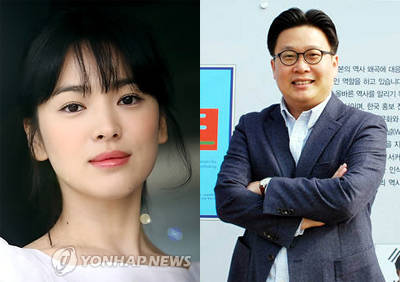 ▲'미국 서재필 기념관에 한글 안내서를 제공한 송혜교(사진=연합뉴스)와 서경덕 교수'.
