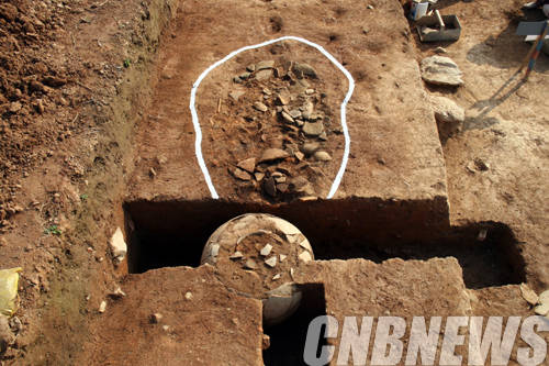 ▲익산 왕궁리유적 서측 궁장 출토 진단구(대형 호)노출 전경.(사진=문화재청)