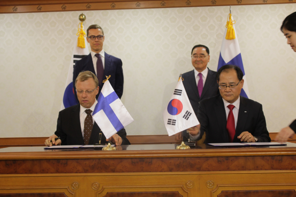 ▲지난 20일 서울 세종로 정부서울청사에서 권오익 대우조선해양 상무(오른쪽) 와 핀란드 나파그룹 유하 헤이킨헤이모 회장이 양국 총리가 지켜보는 가운데 경제운항솔루션인 ‘NAPA-DSME Power’에 대한 계약서에 서명을 하고 있다. (사진제공=대우조선해양)