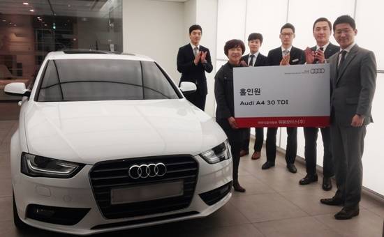 ▲홀인원을 기록한 수상자 장현숙씨에게 부상인 아우디 A4 30 TDI를 전달하는 행사를 17일 위본모터스 서초 전시장에서 진행했다.