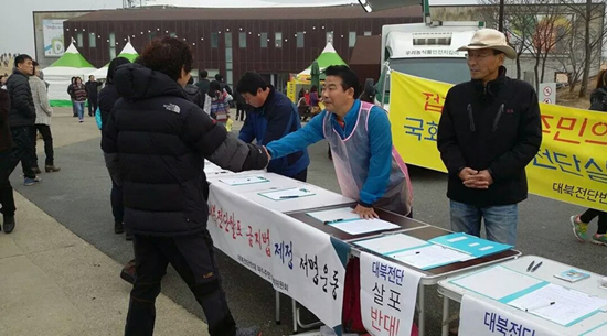 ▲새정치민주연합 박정 위원장이 파주장단콩 축제장에서 대북전단 살표 중단 서명을 받고 있다.