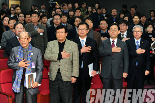 이날 김종덕 문화체육관광부 장관, 신성범 국회의원 등 주요 내빈 및 토론회 참석자들과 국민의례를 하고 있다.