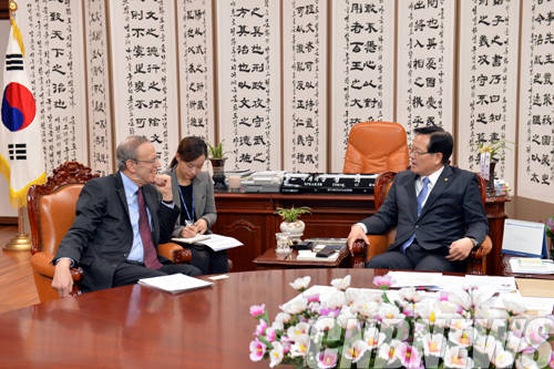 ▲정의화 국회의장은 11월 24일 오후 2시 의장집무실에서 칼 거쉬만(Carl GERSHMAN) 미국 국립민주주의기금(NED) 회장을 접견했다.(사진=국회)