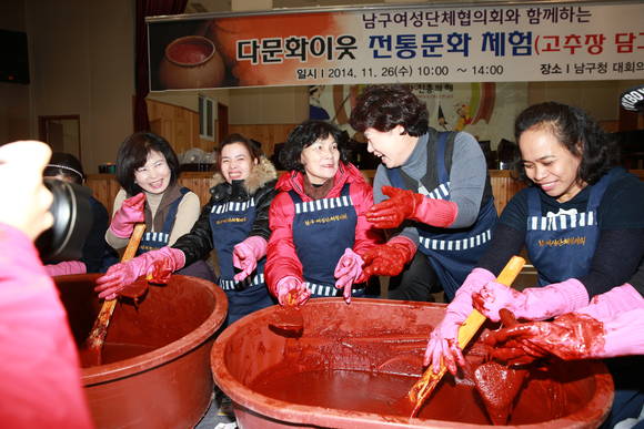 이번 한국전통문화 체험은 다문화가정 결혼이민여성 33명과 남구여성단체회원 11명이 참여, 함께 고추장을 담그는 행사로 진행됐다.