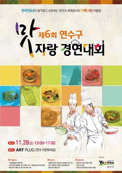 연수구(구청장 이재호)는 지역경제 및 관광산업 활성화를 위한 연수구 대표 맛집을 발굴·육성하고자 『제6회 연수구 맛 자랑 경연 대회』를 오는 28일(금) 연수구 문화의 집(ART PLUG)에서 개최한다.