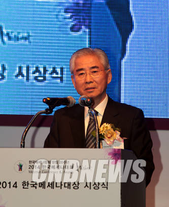 ▲26일 서울 중구 웨스틴조선호텔에서 ‘2014 한국메세나대회’가 열려 문화예술 발전에 공헌한 기업과 기업인들을 포상하는 ‘메세나대상 시상식’이 개최됐다. 이날 클래식 음악 분야의 대표적인 전문시상인 ‘대원음악상’ 등을 통해 한국 클래식 음악 발전을 후원해 온 대원문화재단의 김일곤 이사장이 대통령표창인 메세나대상을 수상하고 소감을 말하고 있다.(사진=왕진오 기자)