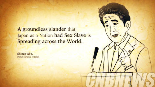 또한 아베 총리를 캐릭터화 하여 지난 10월초 '일본이 국가적으로 여성을 성노예로 삼았다는 근거없는 중상이 전 세계에 퍼지고 있다'라는 아베 총리의 발언을 목소리 그대로 광고안에 넣어 아베 총리의 역사왜곡을 질타했다.