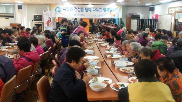 ▲인주새마을금고 양지지점(지점장 이준원)이 25일 갼석1동 주민센터에서 지역 어르신 300여명을 모시고 따뜻한 식사를 대접 하고 있다.
