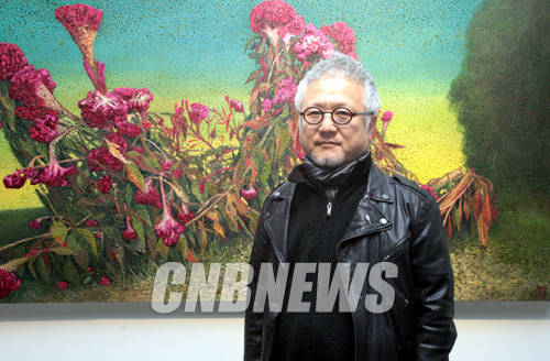 이날 전시장에 함께한 안창홍 작가가 맨드라미 작품과 함께 포즈를 취하고 있다.
