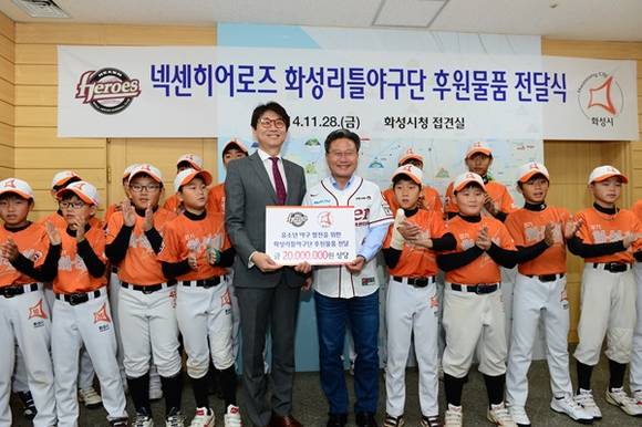 화성시 유소년 야구 발전을 위해 넥센히어로즈 강정호 선수를 비롯해 한현희, 유한준, 손승락 선수 등이 지난 28일 화성시청을 방문해 2000만원 상당의 후원물품을 화성리틀야구단에 전달했다.
