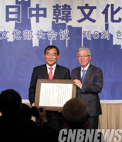 ▲일본 요코하마시에서 개최된 제6회 한중일 문화장관회의 둘째 날인 30일, 회의를 마친 뒤에 김종덕 문화체육관광부 장관이 2015년 동아시아문화도시로 선정된 대한민국 청주시의 이승훈 시장과 기념촬영을 하고 있다. (사진=문화체육관광부)