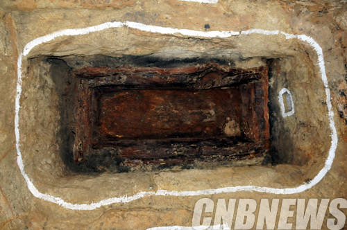 이 토광의 맨 아랫단에 길이 210㎝, 너비 85㎝의 나무 널(목관)과 나무 널을 보호하기 위한 나무덧널(목곽)이 이중의 관곽(棺槨, 시체를 넣는 속 널과 겉 널을 아울러 이르는 말) 형태로 확인됐다.