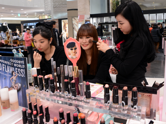 ▲모임이 잦은 연말시즌이 다가오면서 화장을 하기 위한 색조화장품에 관심이 켜져가는 가운데, 롯데백화점 부산본점 지하 1층 화장품 매장을 방문한 여성고객들이 제품을 사용해 보고 있다. (사진제공=롯데백화점)