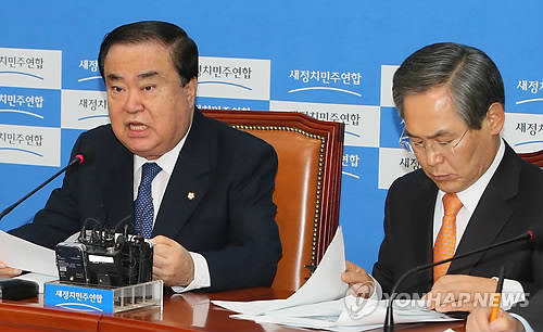 ▲새정치민주연합 문희상 비상대책위원장이 3일 국회에서 열린 비상대책위원회의에서 정윤회씨 등 이른바 비선실세들의 비위 의혹과 관련, "이 사건은 국회에서 다뤄야 한다"며 상설특검과 국정조사 실시를 재차 촉구하고 있다. 오른쪽은 우윤근 원내대표.(사진=연합뉴스)