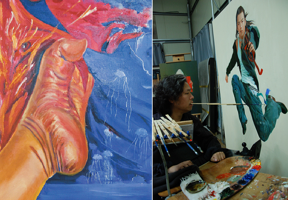 ▲족필화가 김인식의 ‘나의 왼발’ 작품(왼쪽), 입으로 그림을 그리고 있는 구필화가 박정. (사진제공=천호식품)