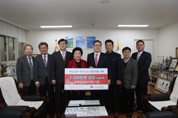 롯데삼동복지재단(이사장 신영자)은 지난 4일 부산 중구청(구청장 김은숙)을 방문, 지역 저소득 독거노인들을 위한 방한이불 400매(2천만원 상당)를 기탁했다. (사진제공=부산 중구)