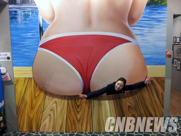 사진은 러브뮤지엄에 새로 전시된 작품에서 포즈를 취하며 전시를 즐기고 있는 방문객.