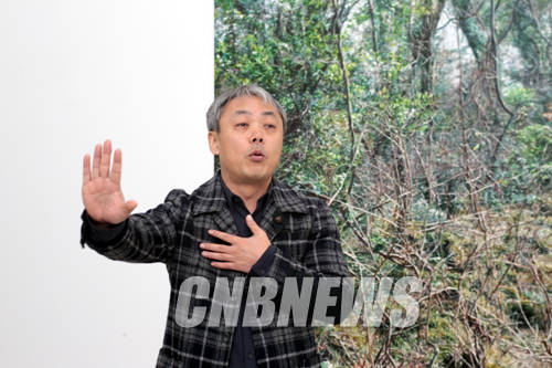 ▲9일 서울 종로구 삼청로 국제갤러리 1관에서 '그림 풍경'전 설명회가 열렸다. 이날 전시 주인공인 이화여대 이광호(47) 교수가 전시장에 걸린 겨울 숲을 그린 그림을 설명하고 있다.(사진=왕진오 기자)