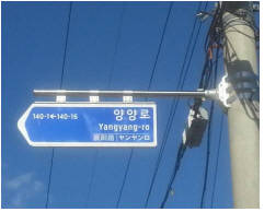 군에 따르면 2018평창 동계올림픽 홍보와 현재 시행 중인 도로명 주소의 홍보와 정착을 위해 이번에 추가로 설치하는 것이며 양양 전통시장과 양양 국제공항 등에 외국인 이용객이 쉽게 길을 찾을 수 있도록 영어와 병기해 중국어와 일본어로 표기된 제2외국어 도로명판을 설치한다고 밝혔다.