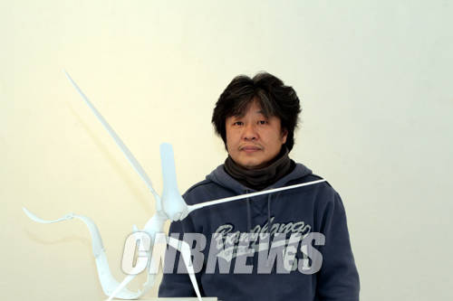 ▲'껍질의 유혹' 작품과 함께한 윤두진 작가.(사진=왕진오 기자)