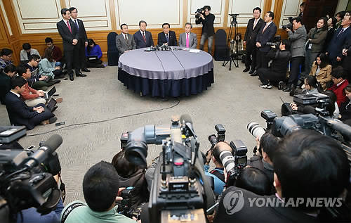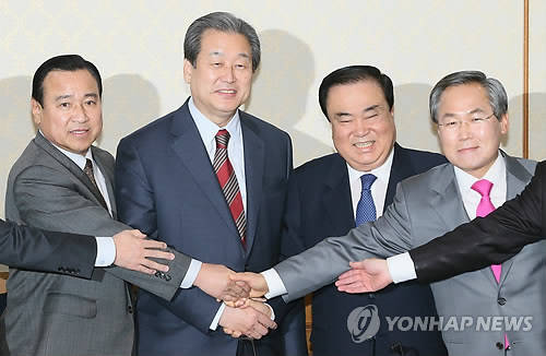 ▲새누리당 이완구 원내대표(왼쪽 부터), 김무성 대표와 새정치민주연합 문희상 비상대책위원장, 우윤근 원내대표가 10일 국회 귀빈식당에서 회동하고 있다. (사진=연합뉴스)