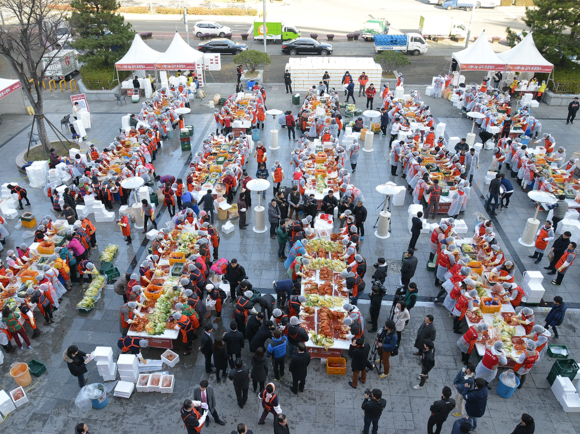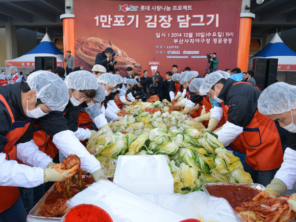10일 부산지역 롯데백화점을 비롯한 13개 지역 롯데관계사들이 연말연시를 맞아 사직야구장에서 지역민과 사량을 나누기 위한 ‘1만포기 김장 담그기’ 행사를 진행했다. 절임배추 1만포기 총 2만kg, 김치 포장박스 3600개 등 비용 전액을 롯데관계사가 지원했고, 부산시 푸드뱅크를 통해 저소득층 및 사회복지시설에 전달될 예정이다. (사진제공=롯데백화점 부산본점)