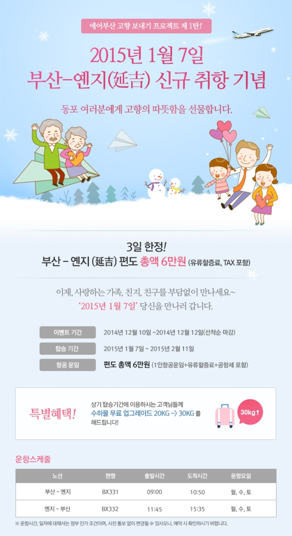 10일 오후 2시부터 12일 자정까지 선착순 마감되는 이번 이벤트 항공권의 운임은 편도기준 6만원(총액운임)이며, 무료수하물 기준도 기존 20Kg에서 30Kg까지 제공할 예정이다. 해당 항공권의 탑승기간은 오는 1월 7일부터 2월 11일까지로 이번 이벤트를 통해 고향인 옌지로 돌아가는 동포들의 부담감을 줄일 수 있을 것으로 기대된다.