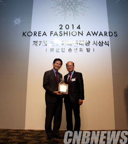 ▲10일 오후 서울 양재동 엘타워에서 제7회 코리아패션대상 시상식이 열렸다. 이날 김문수 새누리당 보수혁신특별위원회 위원장이 특별공로상을 수상하고 있다.(사진=한국패션협회)
