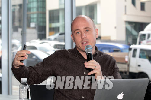 ▲11일 서울 강남구 언주로 현대 모터스튜디오에서 미디어아트그룹 UVA의 뉴미디어아트 작품 '움직임의 원리2' 설명회가 열렸다. 이날 설명회에 함께한 UVA 총괄 책임자 매튜 클라크(Matthew Clark)가 현대모터스튜디오 1층에서 '움직임의 원리2'작품에 대해 설명하고 있다.(사진=왕진오 기자)