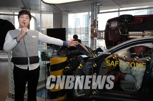 이날 설명회를 통해 스튜디오에 공개된 제너시스 충돌실험 실제 차량을 도슨트 역할을 하는 '구루' 직원이 설명하고 있다.