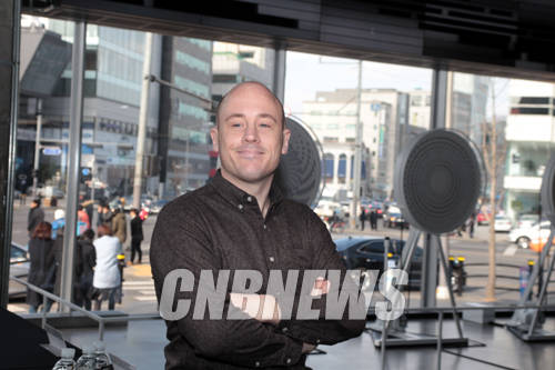▲11일 서울 강남구 언주로 현대 모터스튜디오에서 미디어아트그룹 UVA의 뉴미디어아트 작품 '움직임의 원리2' 설명회가 열렸다. 이날 설명회에 함께한 UVA 총괄 책임자 매튜 클라크(Matthew Clark)가 현대모터스튜디오 1층에 설치된 '움직임의 원리2'작품앞에서 포즈를 취하고 있다.(사진=왕진오 기자)